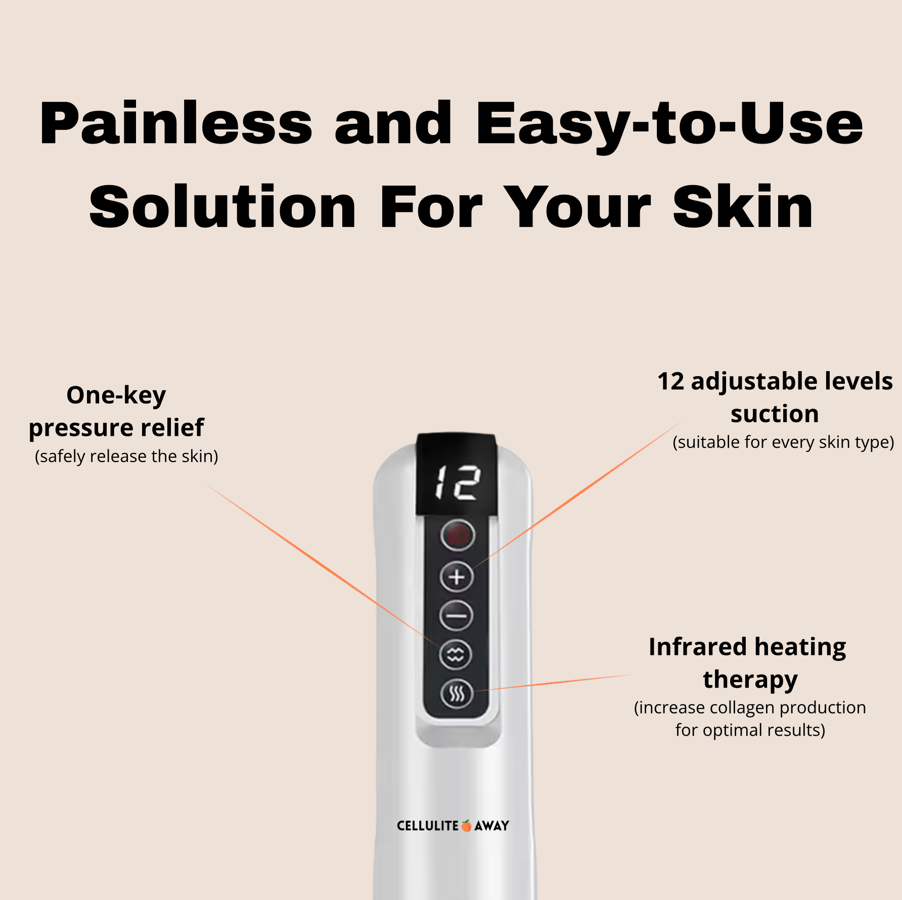 Engineered with 12 adjustable suction levels, this device adapts perfectly to your needs. It penetrates deep into fat cells while remaining safe and comfortable, even for delicate or sensitive skin.